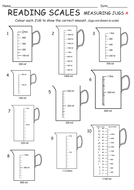Volume and Capacity Worksheets - EasyTeaching.net Read scale of a 250mL container with labelled 50mL increments. Reading Scales 10L: 1L. Read scale of a 10mL container with labelled 1L increments. Reading Scales Mixed Set. Work out the volume of containers with different scales. Reading Scales Mix 1. Work out the volume of containers with different scales. Measuring Jug - Printable Worksheets Showing top 8 worksheets in the category - Measuring Jug. Some of the worksheets displayed are Reading scales on a measuring jug, Measuring jug 2, Measuring jug 3, Reading from a measuring jug, Capacity measuring jugs work, How much water will the jug now contain, Collect student can students accurately draw, Volume capacity and mass.